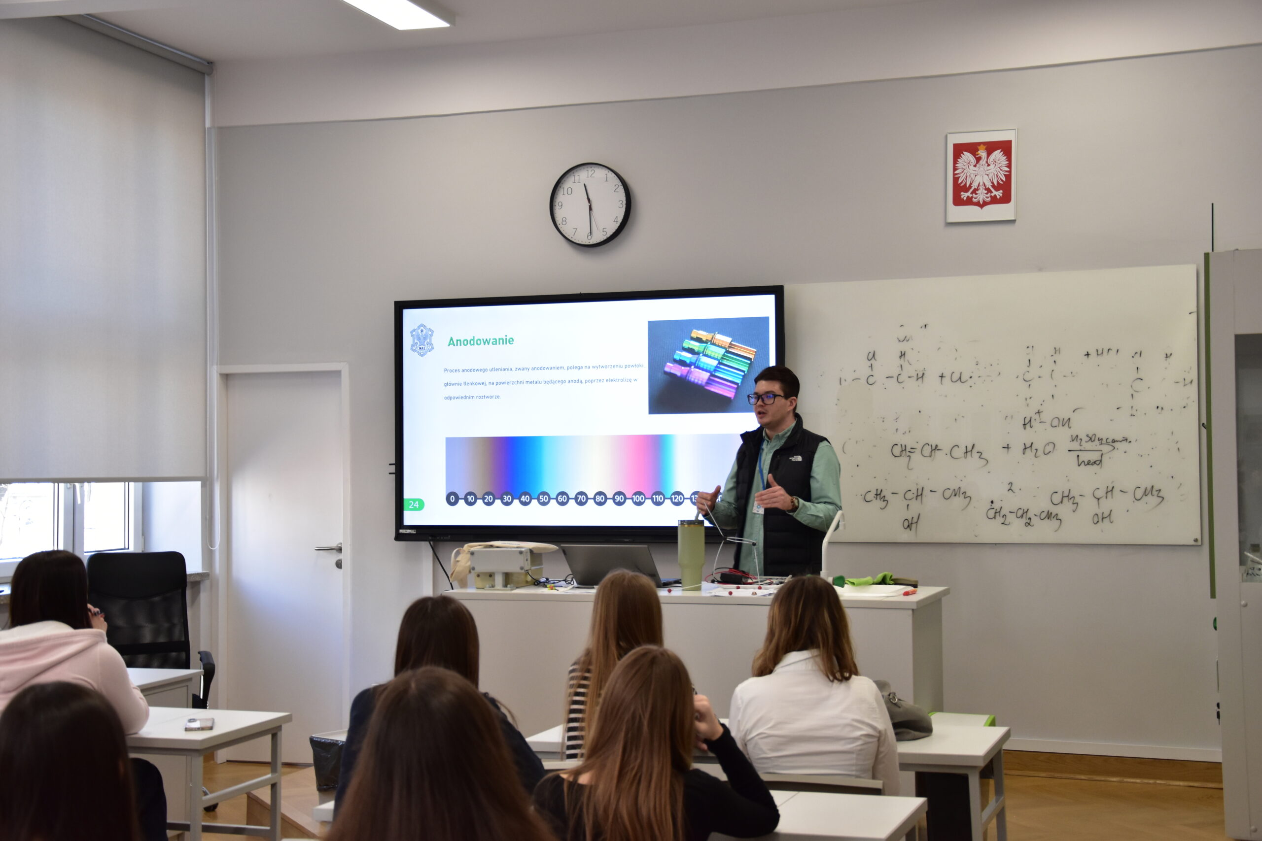 Koło Naukowe Venturi z Politechniki Warszawskiej poprowadziło warsztaty poświęcone barwom związków chromu i manganu. W ramach bloku chemicznego odbył się także wykład dr inż. Agaty Dorosz dotyczący aerozoli i ich wpływu na zdrowie.