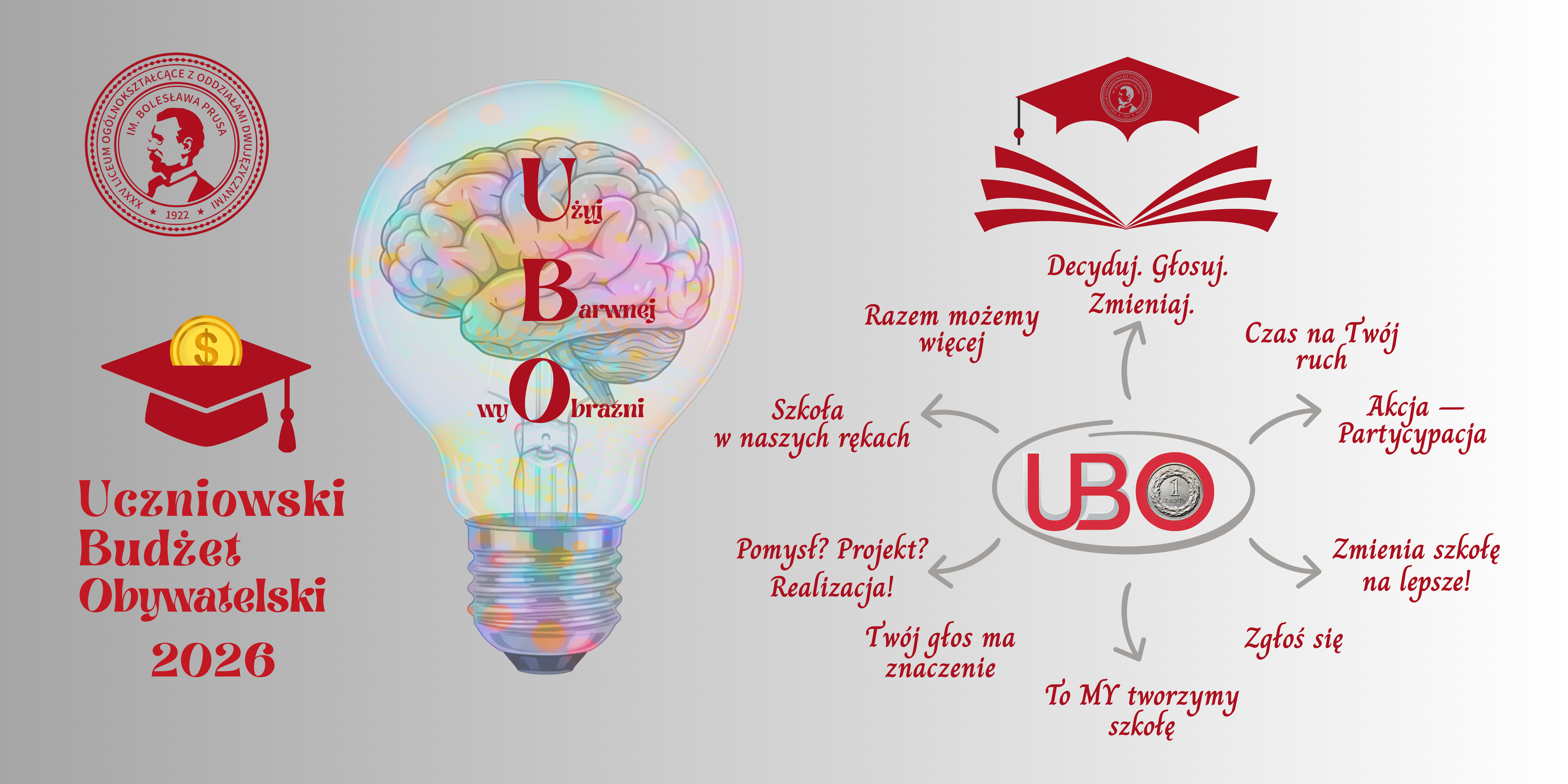 26 marca 2026 godz. 12:30 w Strefie Ciszy – spotkanie informacyjne dotyczące pisania projektów. Poinformowanie uczniów o rozpoczęciu UBO i zasadach uczestnictwa. Kampania informacyjna obejmie spotkania, plakaty, informacje na stronie internetowej oraz media społecznościowe szkoły.